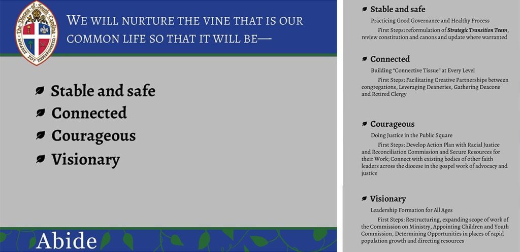 Following a a report from the New Parishes and Missions Committee, Mr. Bill Thornsby and Ms. Shawan Gillians, senior wardens at St. Francis, Charleston, and St. Mark’s, Charleston, respectively, were asked to share with the Convention plans for a creative partnership between the two churches. Watch this presentation at this link.