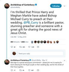 “I’m thrilled that Prince Harry and Meghan Markle have asked Bishop Michael Curry to preach at their wedding,” Archbishop Welby said via Twitter, calling him “a brilliant pastor, stunning preacher and someone with a great gift for sharing the good news of Jesus Christ.”