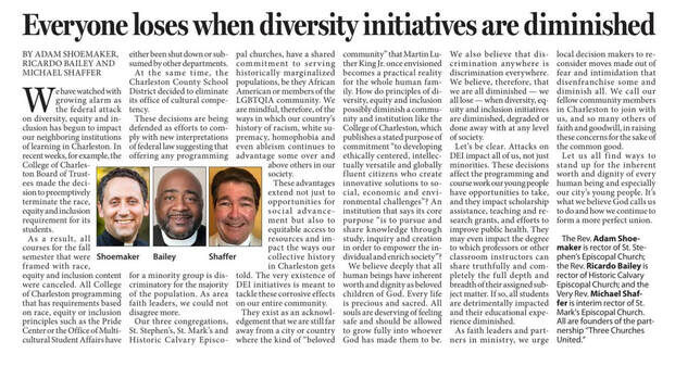 APRIL 3, 2025 – Thank you to the Revs. Adam Shoemaker, Ricardo Bailey, and Michael Shaffer for using their voices to speak out on recent efforts to oppose or eliminate measures that support diversity, equity, and inclusion in various areas of our community. The three priests of “Three Churches United” in downtown Charleston were co-authors of an op-ed published April 3, 2025 in the Charleston Post & Courier.