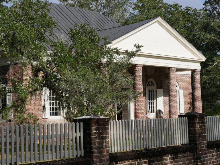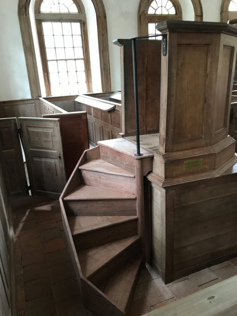 The church’s design is a combination of Georgian and Classical architectural elements with local and imported materials. The body of the church is English brick, while the wedge-shaped bricks throughout the portico columns were made locally. Today, the flagstone floor is worn smooth from countless feet, beneath the original plasterwork of the high, vaulted ceiling.