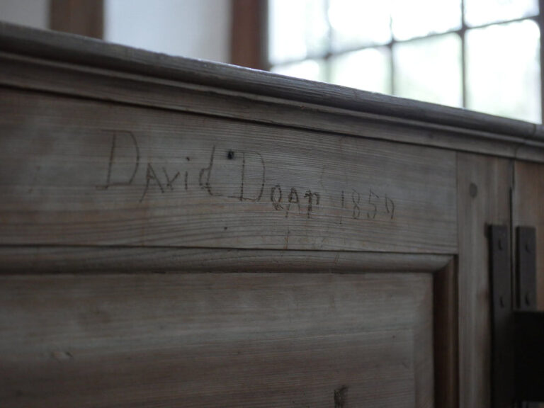 The Rev. Alex Barron’s great-grandfather carved his name in the door to a pew